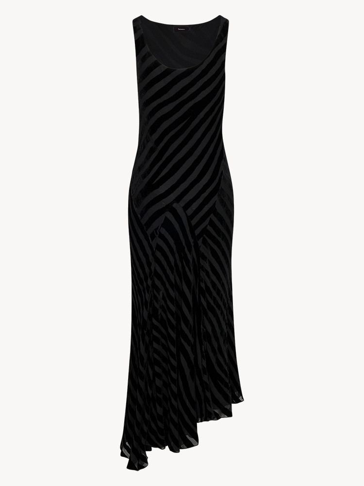 The sleeveless midi with a high neckline and draped skirt in slinky, striped devoré velvet is as luxe as she looks. Bias-cut to flatter every Dreamgirl shape and lined in silk georgette, The Romy moves just the way you want her to - chic and elegant. She’s the one you reach for when you need that perfect event dress.