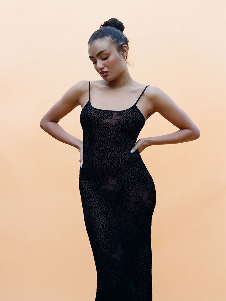 Sheer, black, dotted with velvet butterflies and ready to be accessorised - introducing the Alana. That long slip shape that covers all bases in velvet devoré fabric. Show it all off with cheeky coloured underwear and add big bold earrings, or keep her more subtle with a perfect black knicker and sexy pump.