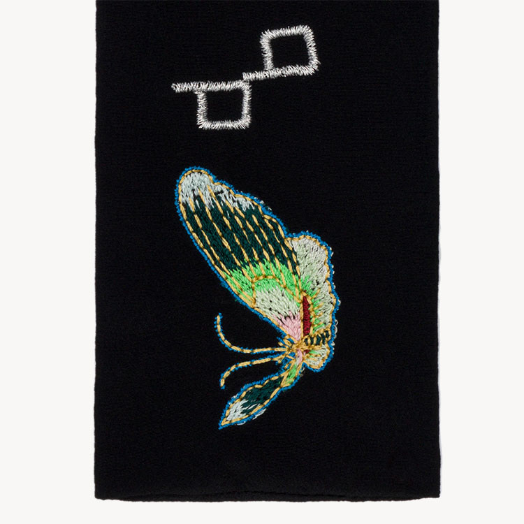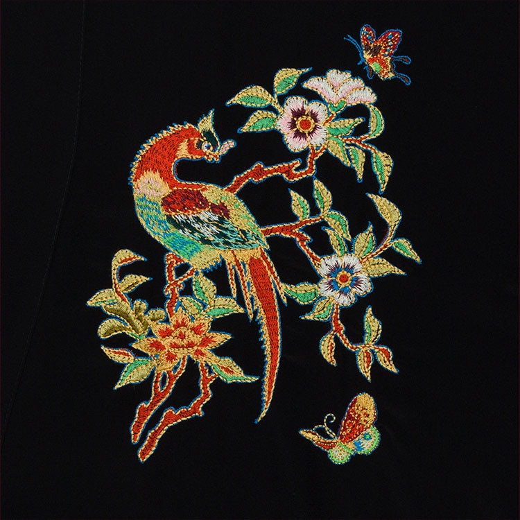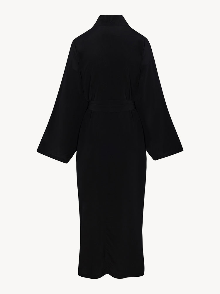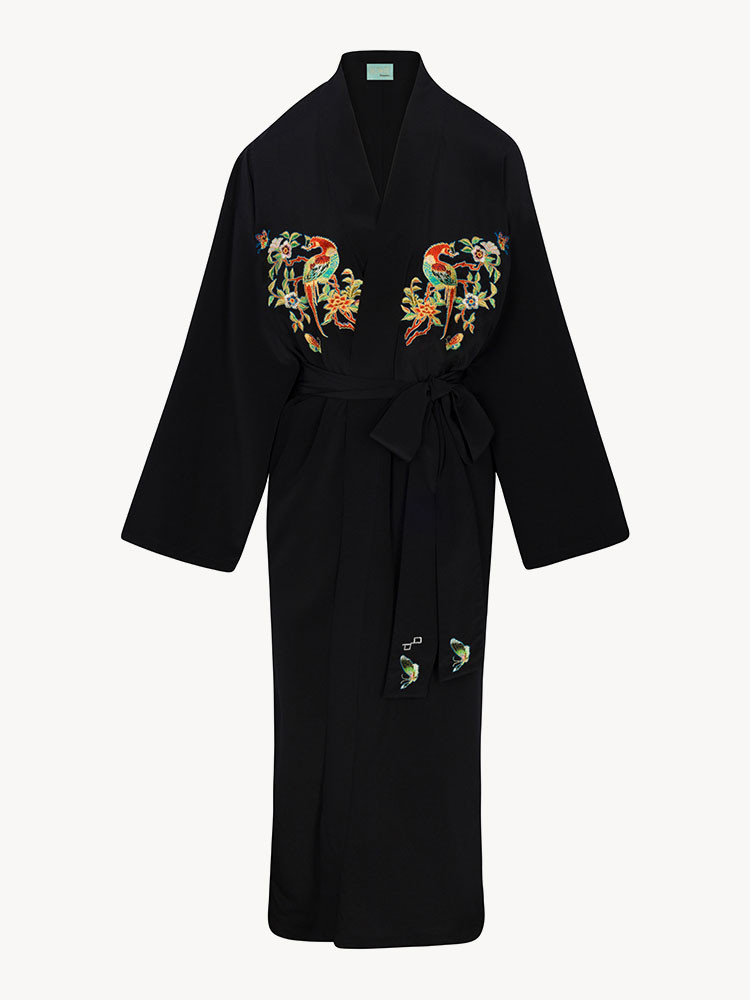 Lounge around in Bowie style in the Serious Moonlight Robe. The long sleeved, full length black silk robe is reminiscent of lush hotel moments, the Man Who Fell to Earth and all things luxe. With a Bird of Paradise embroidery that comes from a Serious Moonlight tour poster, and a small DB on each of the straps - the Serious Moonlight Robe will have you swooshing through any situation in pure David Bowie form.